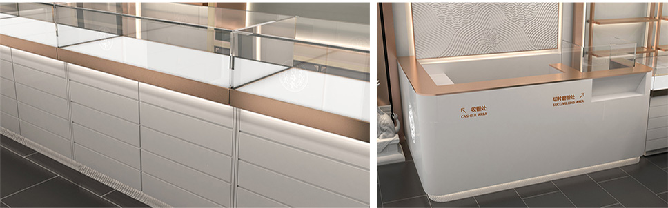 采用深灰、白和玫瑰金色搭配,使整體店面既有富麗堂皇之氣場,也有清新脫俗之雅韻。一方面與同仁堂傳統店面形象區分開來,另一方面在傳承同仁堂文化的同時也對同仁堂形象進行了升華,使其店面更具視覺特點和識別性;更加現代時尚,符合未來人群的審美情趣。