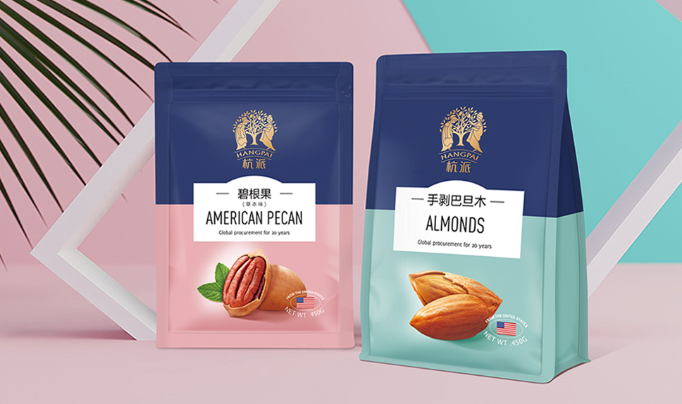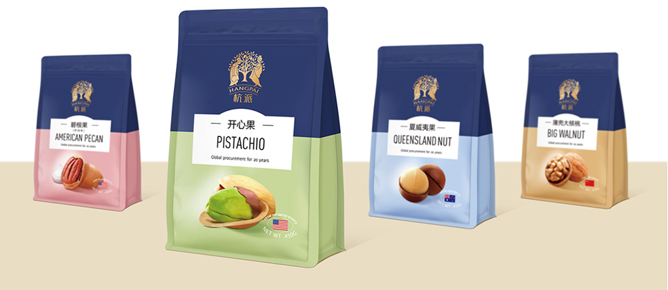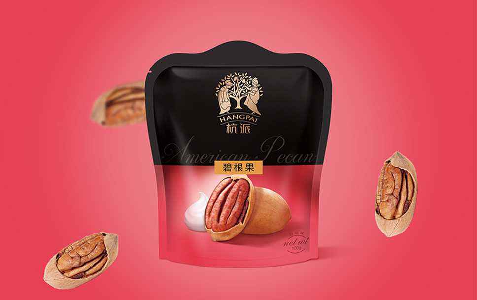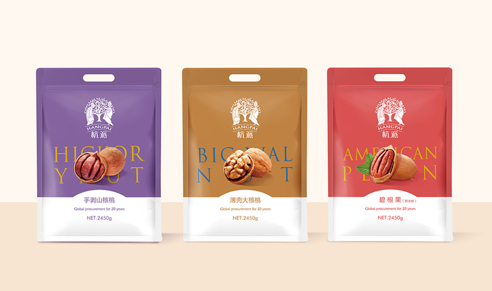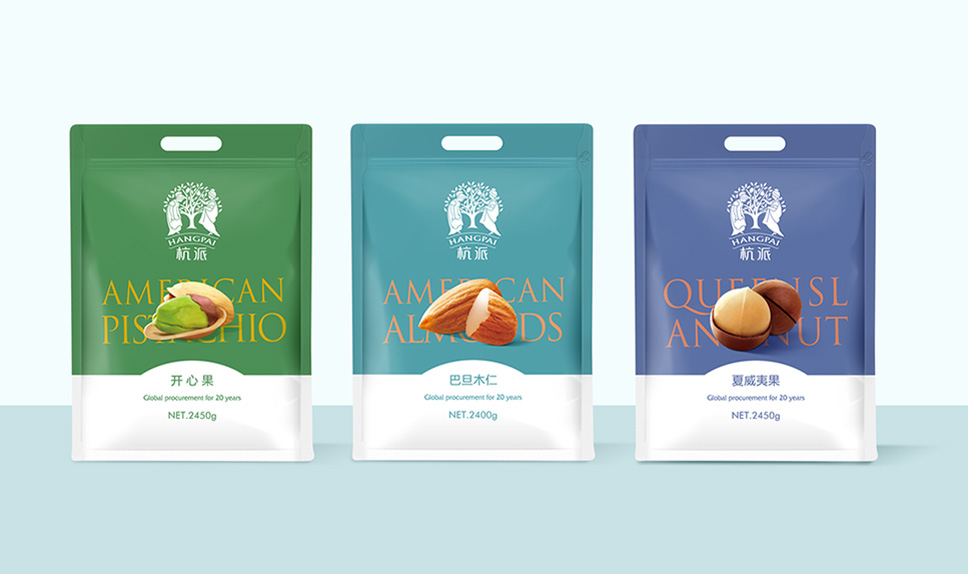 李華清項(xiàng)目團(tuán)隊(duì)將書(shū)手抓包采用透明pe袋,能讓消費(fèi)者直觀看到堅(jiān)果實(shí)物,飽滿的堅(jiān)果,甚至能透過(guò)包裝袋就能感受到香氣四溢出來(lái),營(yíng)造消費(fèi)者心里的滿足感和食欲感,增加受眾對(duì)品質(zhì)的信任度。同時(shí)核心視覺(jué)元素延用杭派戰(zhàn)略資產(chǎn),達(dá)到包裝視覺(jué)聚焦的效果,在終端的不斷市場(chǎng)傳播中,形成杭派強(qiáng)有力的品牌資產(chǎn)。