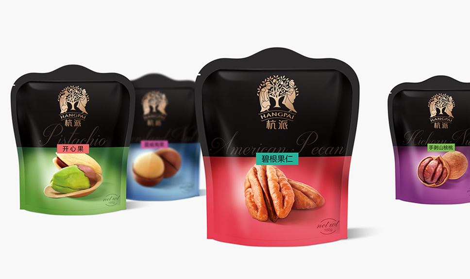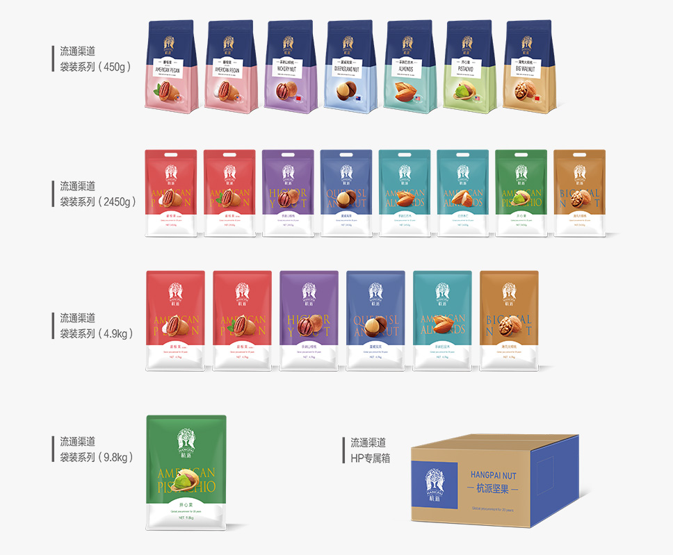 杭派堅(jiān)果主要是碧根果、巴旦木、山核桃、開(kāi)心果、夏威夷果、核桃六大品類的產(chǎn)品線延伸,在色彩資源配置上每個(gè)堅(jiān)果品類獨(dú)占一個(gè)色系,在可以在消費(fèi)者心中形成一個(gè)專屬色。